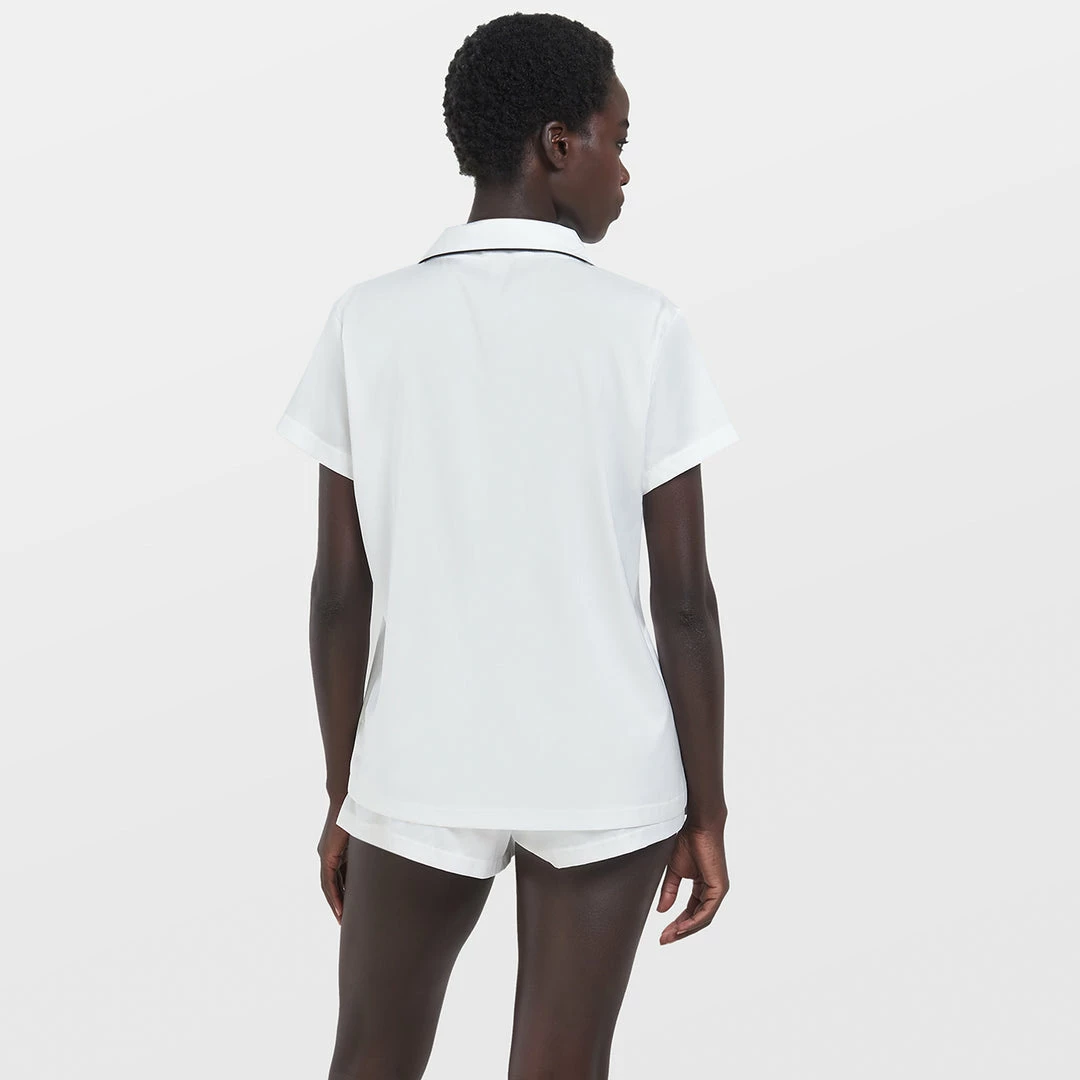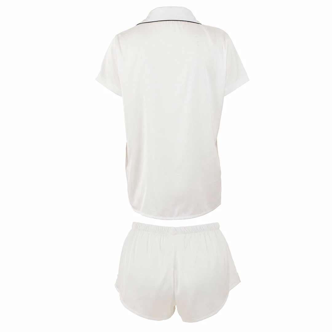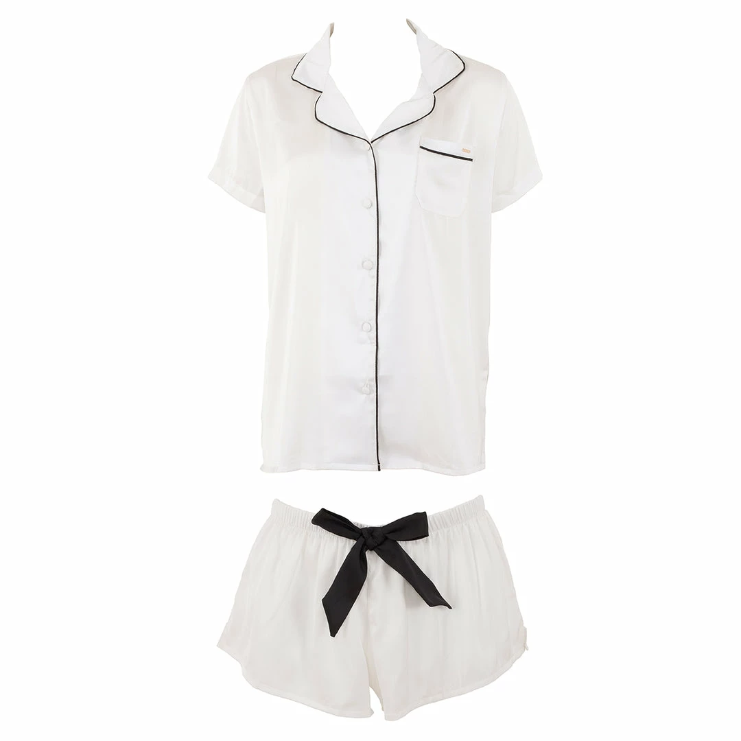 Our bestselling Abigail Shirt and Short Set is now available in fresh ivory. With contrast piping and bow, this is the perfect spring-time loungewear set.