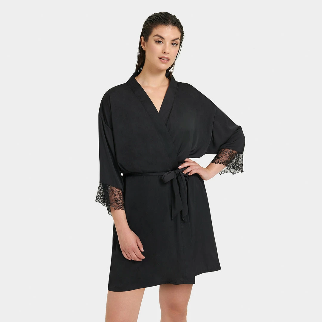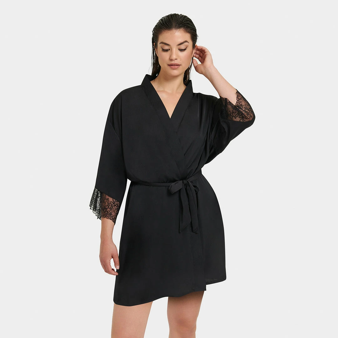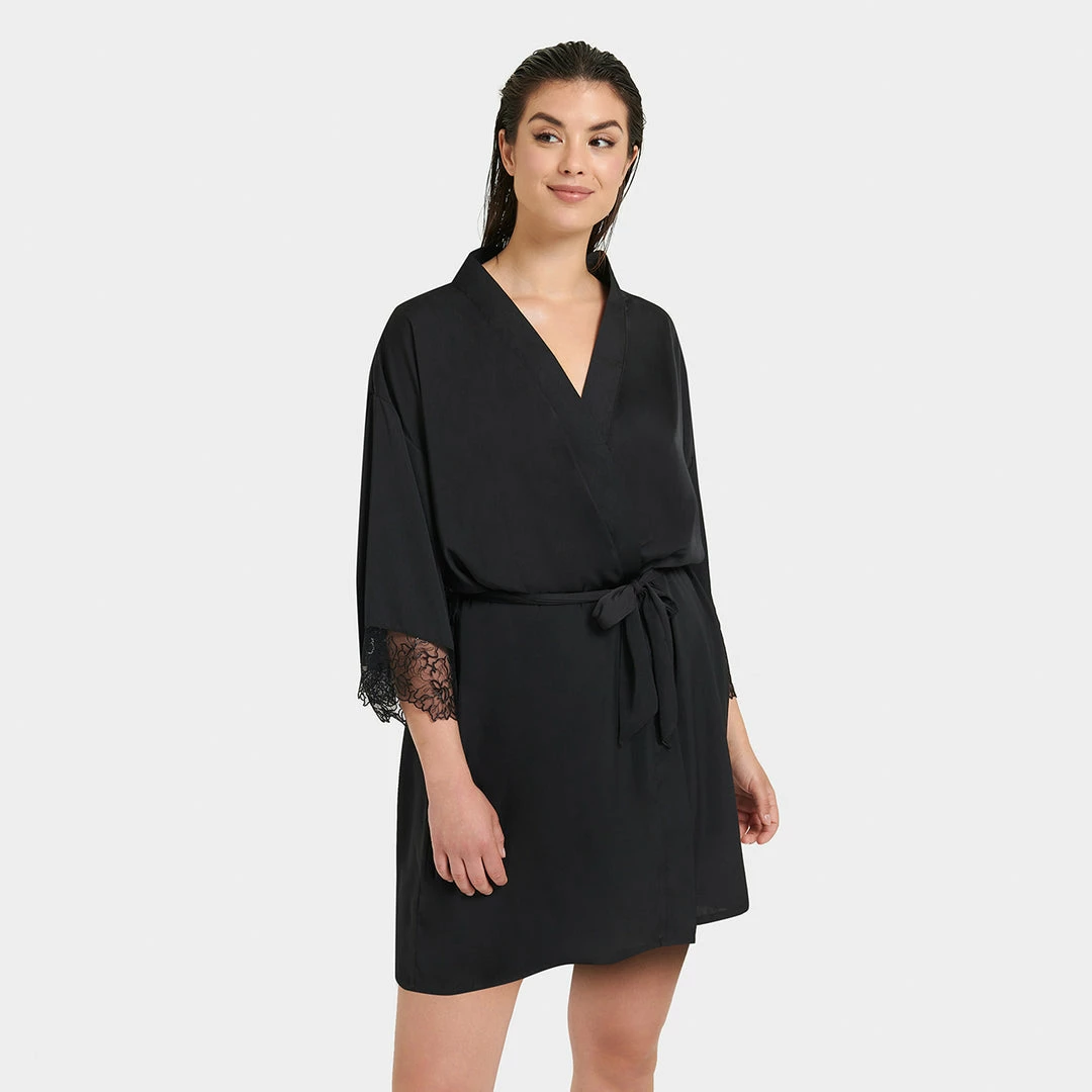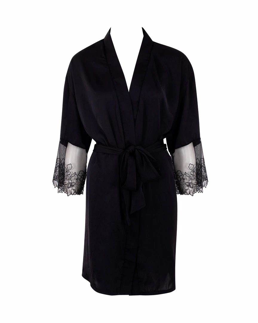 The perfect piece for wrapping around yourself after a long day, post-shower or as a finishing touch to your Alanna set, this gorgeous kimono is trimmed with intricate lace to the sleeves for a touch of elegant drama. The sleek, satin silhouette is complete with a matching tie belt that lets you modify the fit and decide just how much you’ll choose to conceal.
