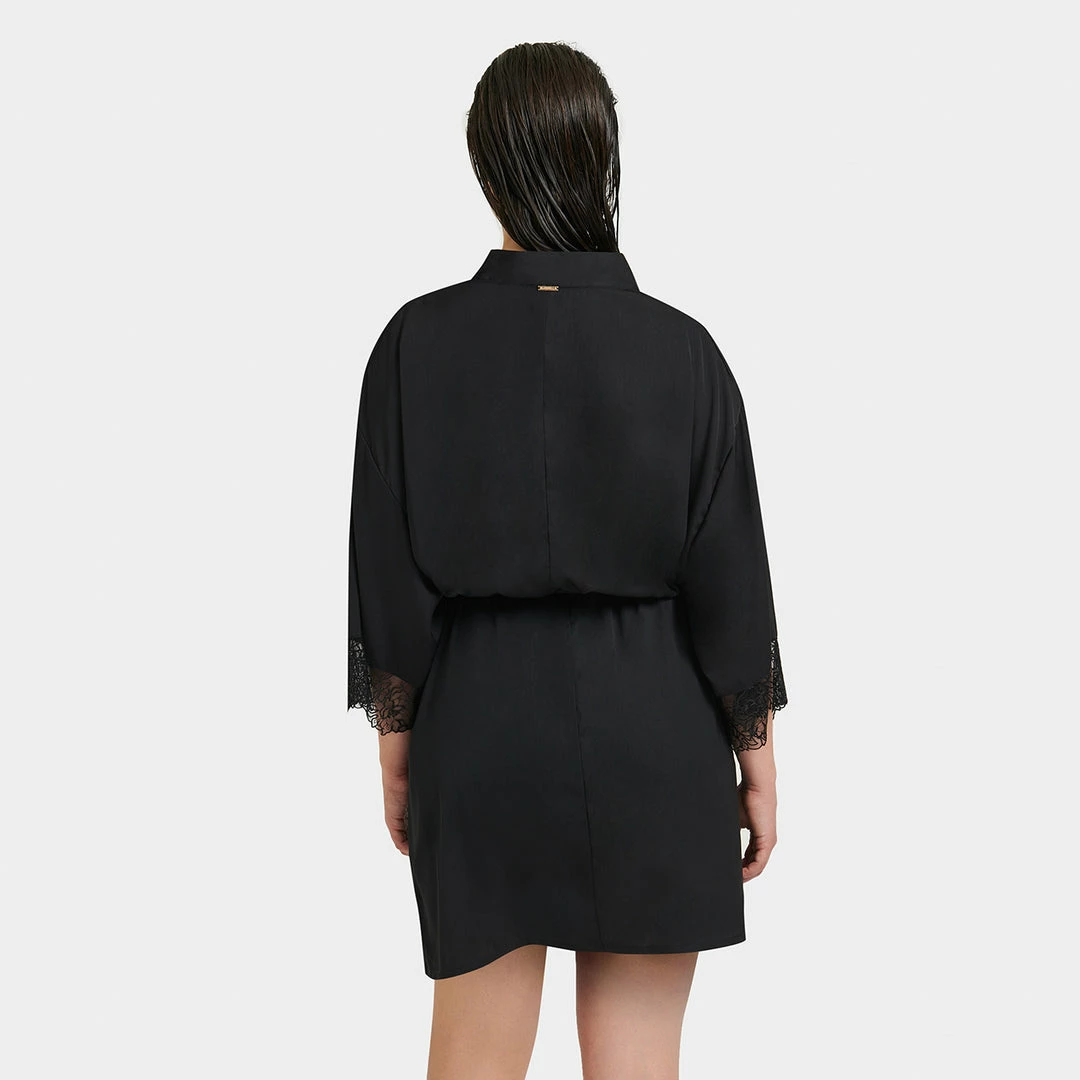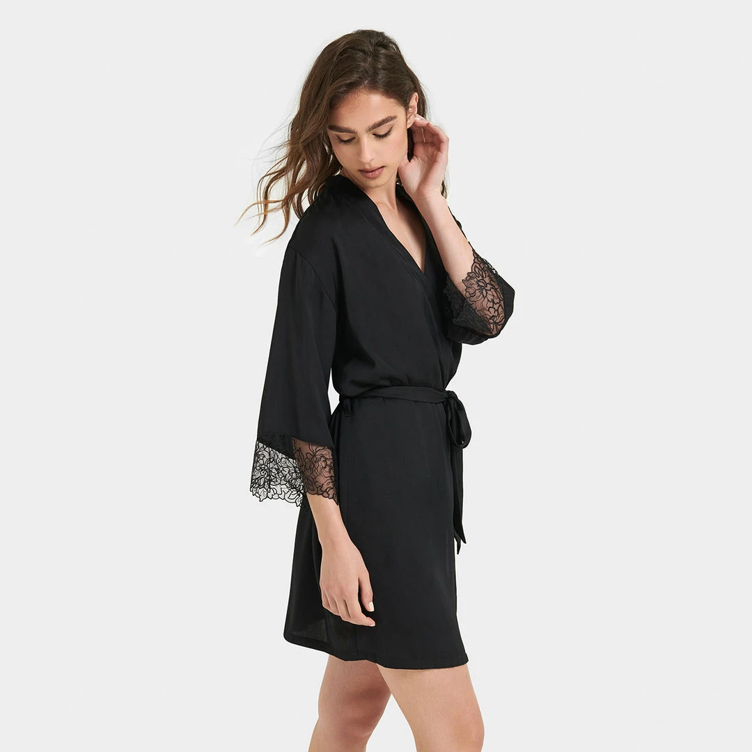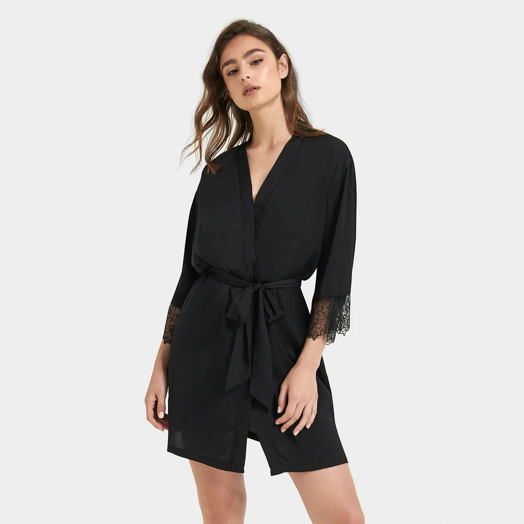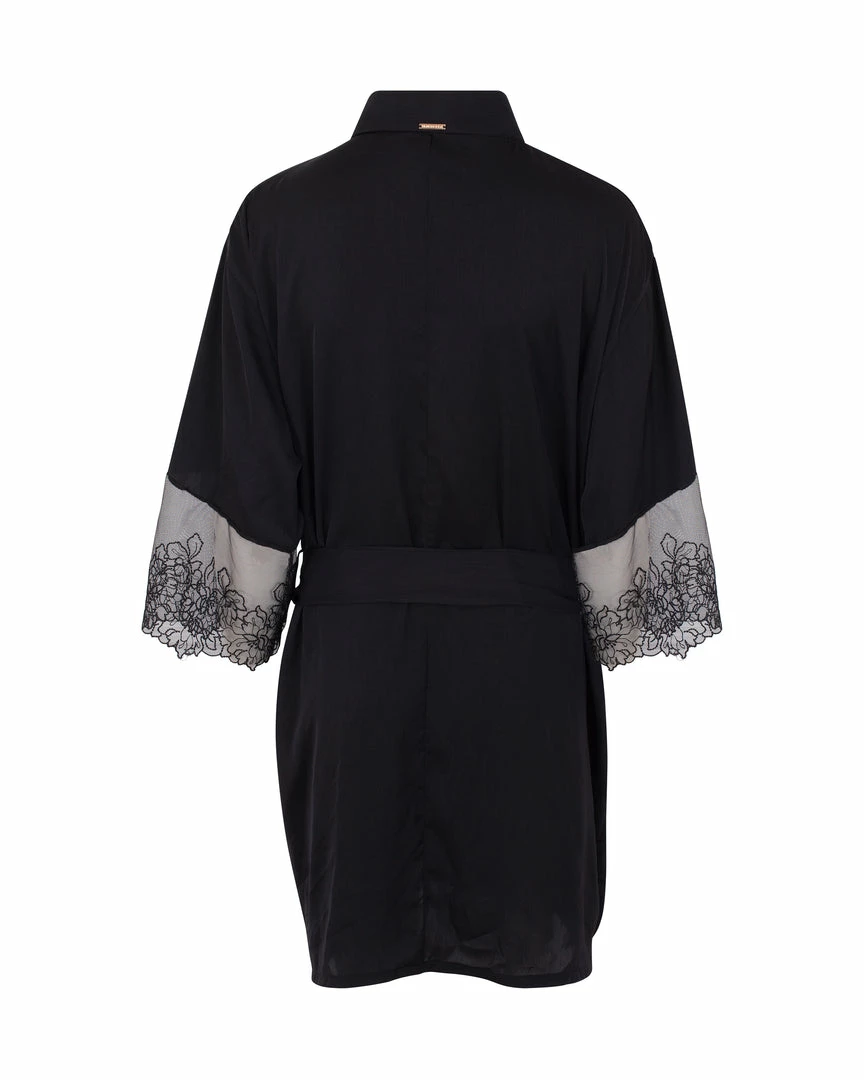 The perfect piece for wrapping around yourself after a long day, post-shower or as a finishing touch to your Alanna set, this gorgeous kimono is trimmed with intricate lace to the sleeves for a touch of elegant drama. The sleek, satin silhouette is complete with a matching tie belt that lets you modify the fit and decide just how much you’ll choose to conceal.