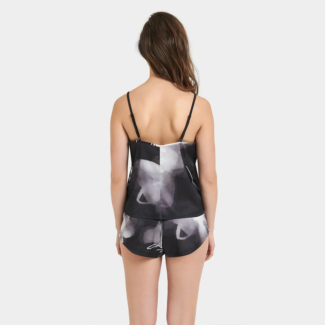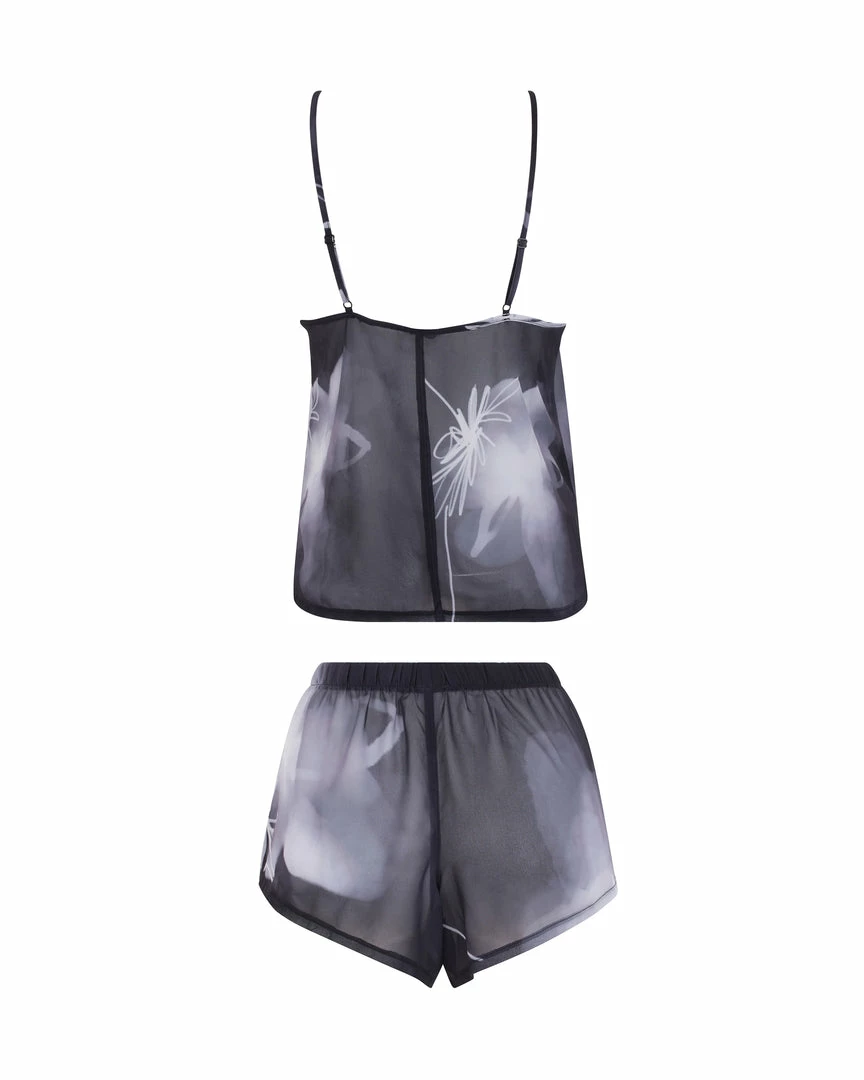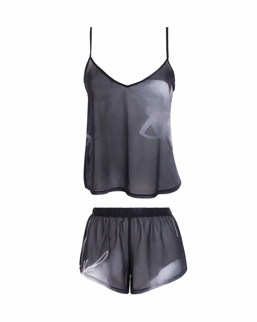 Bring a luxurious mood to your loungewear edit with the ethereal Camille cami and short set. This delicate, semi-sheer duo features an abstract print and a flowing silhouette, lending a distinctively seductive note to those moments of relaxation. Slip it over your favourite lingerie or wear solo to fully unleash its provocative undertones.