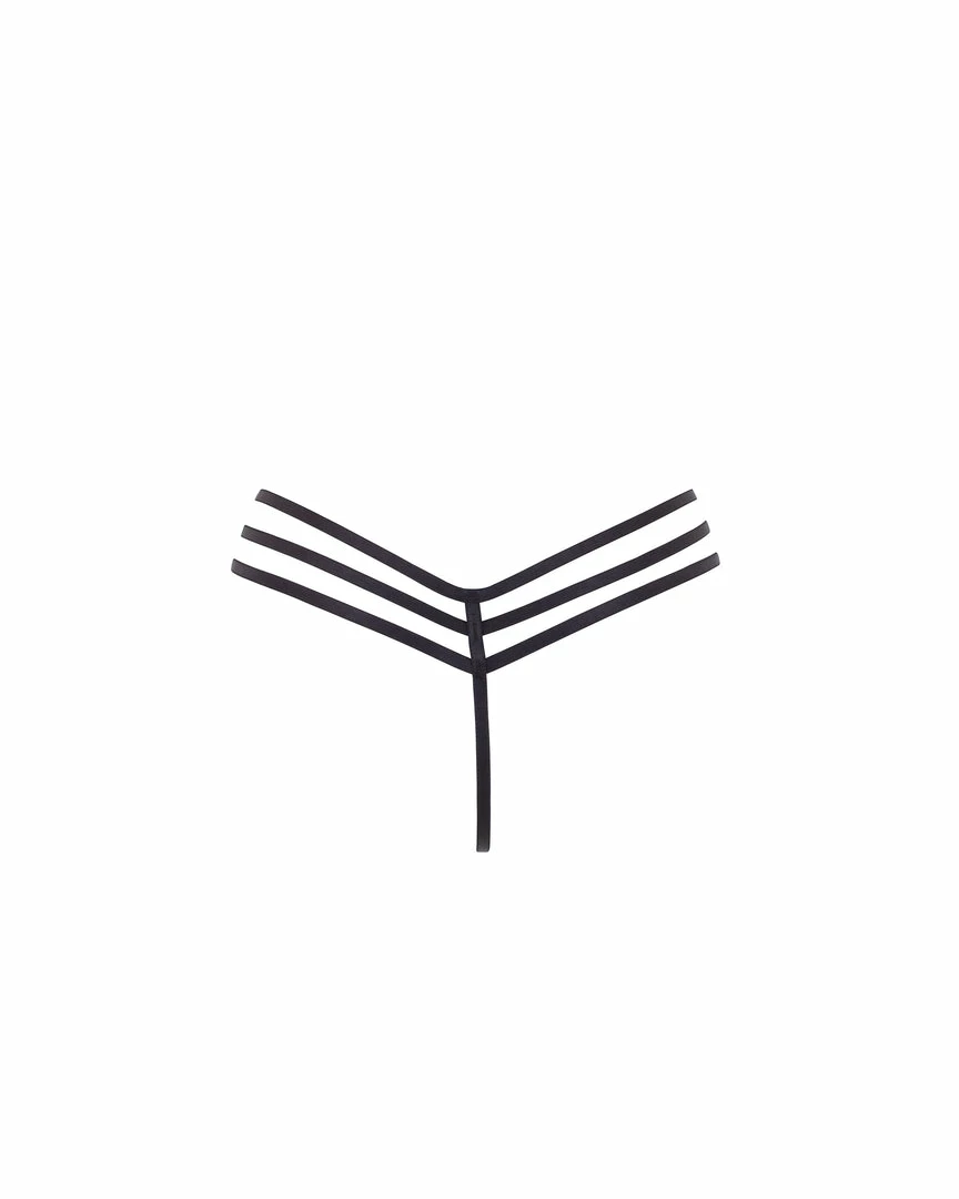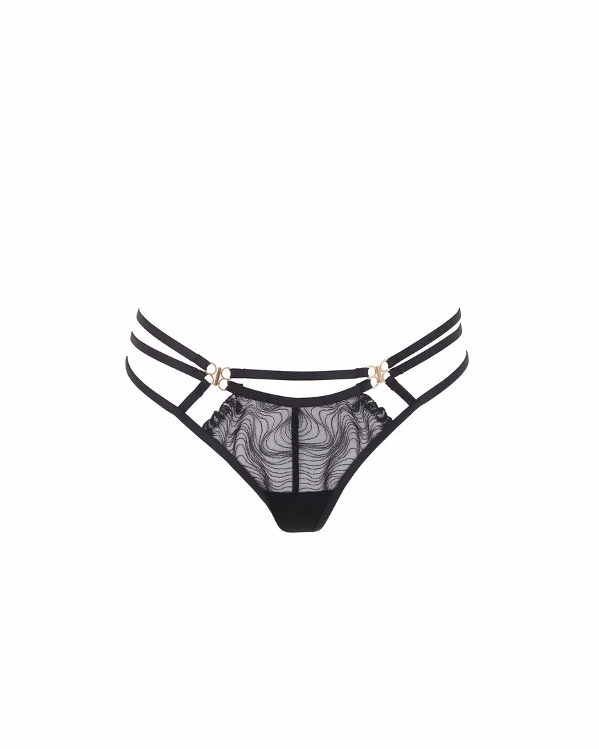 Catching the eye with its unique structure and gorgeous embroidery, the Cassia thong is proof that lingerie is close to becoming art. Featuring multiple straps that create a directional silhouette, as well as the signature gold-tone hardware that lends the necessary dose of opulence, this elegant piece is one you’ll reach for when in need of seductive empowerment. Style it with the matching Cassia bra to experience the power that only a complete set can give.