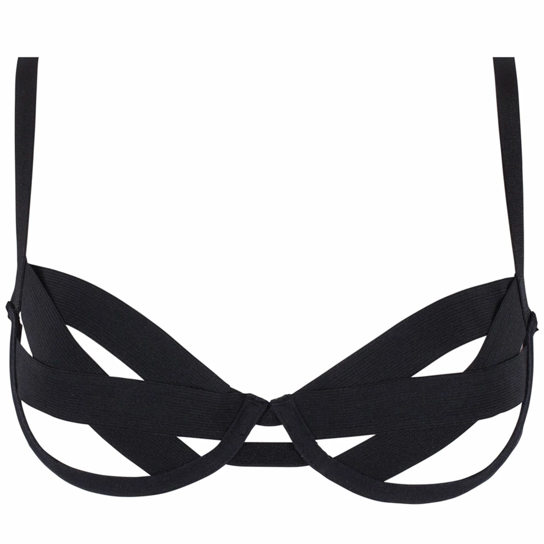 Provocative underwired bra with triple crossover strap cup detail. The soft elasticated straps can be positioned to give the desired level of coverage. With soft mesh to the side wing, and hook and eye back fastening.