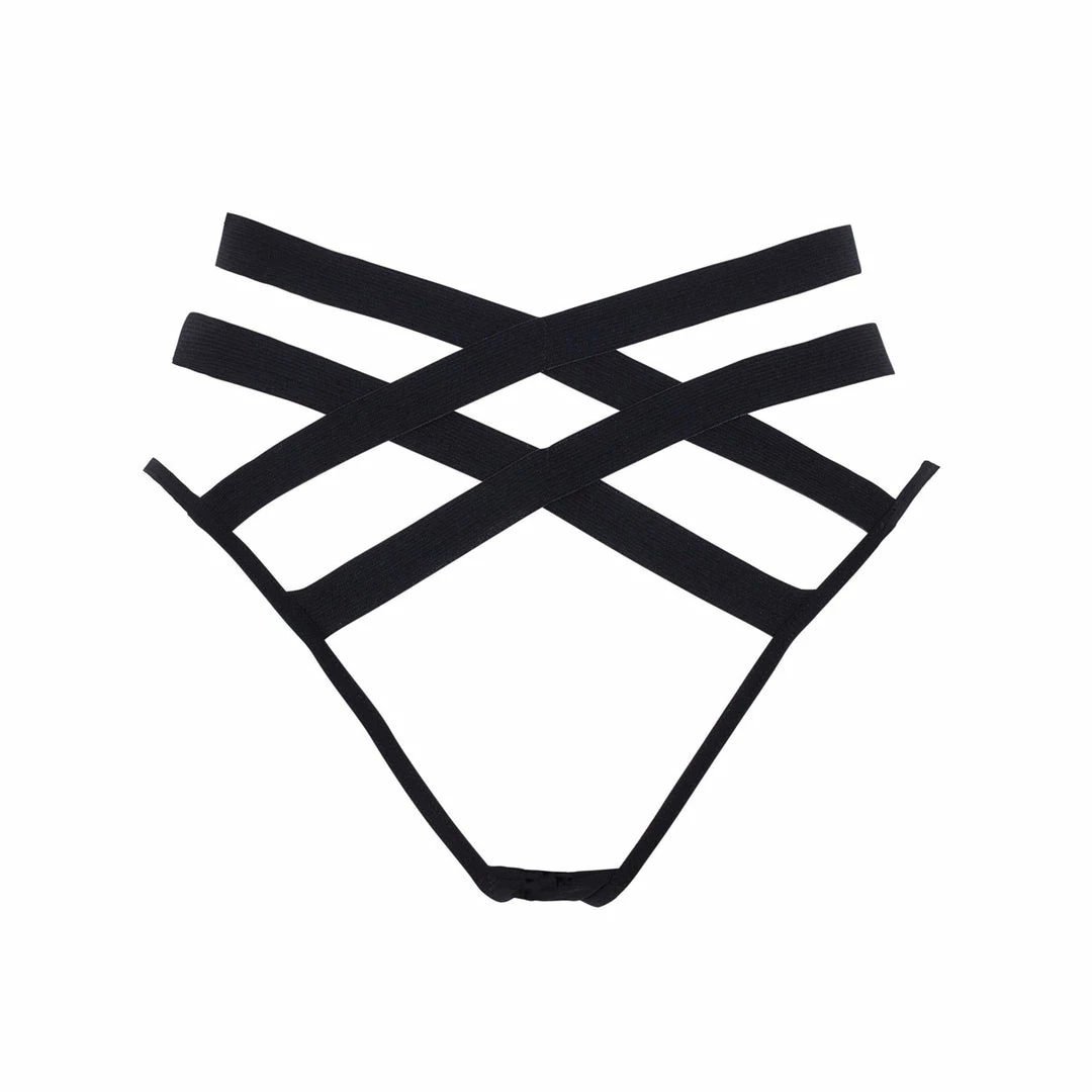 Provocative crossover strap detail open brief. The softly elasticated straps flatter and enhance, creating a seductive silhouette. Style with the matching bra.