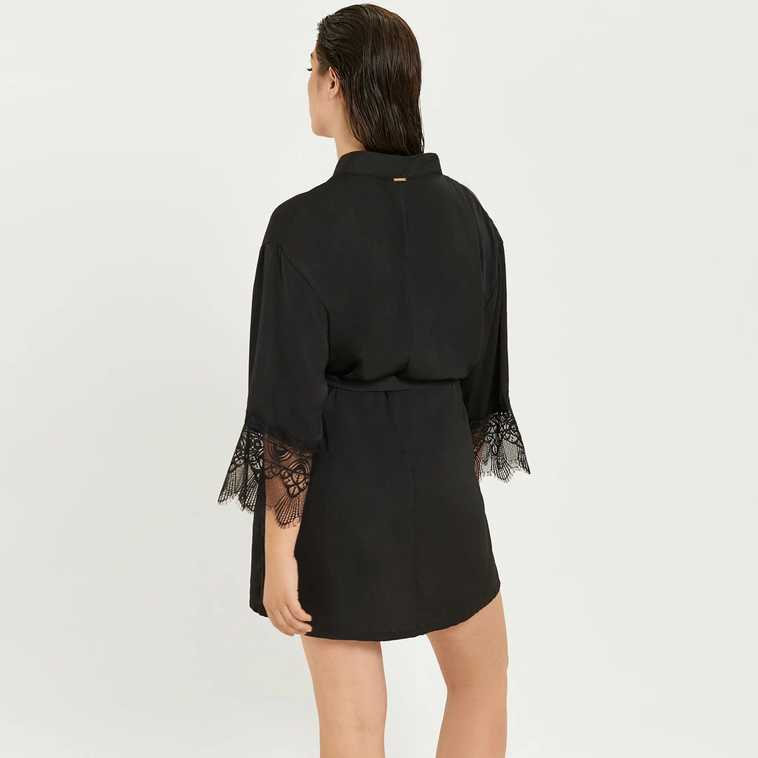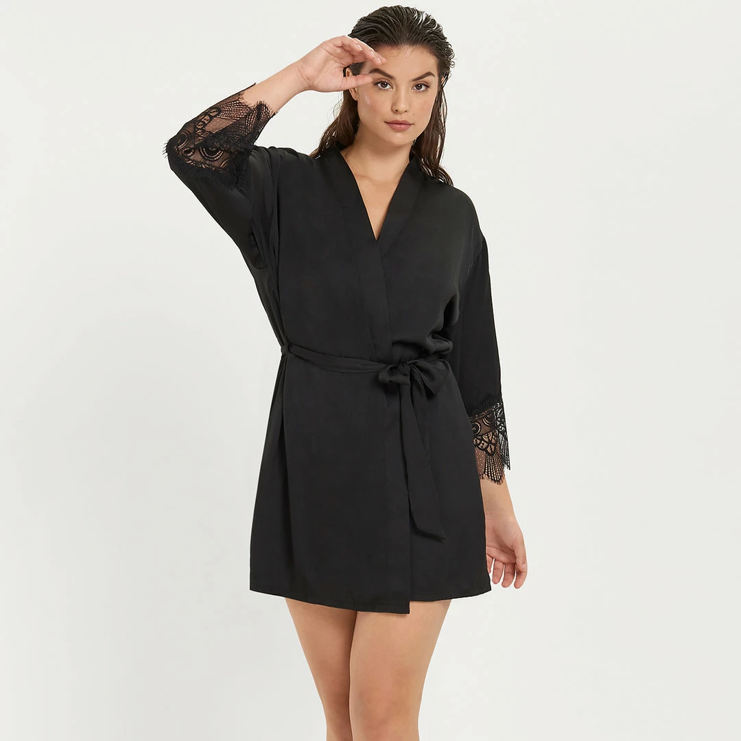 The perfect finishing touch to the Arabella collection, this classic kimono is trimmed at the sleeves with intricate Art Deco-inspired lace that heightens the dramatic impact of the style. The flowing design is complete with a matching tie belt that lets you add a personal touch to the silhouette and decide exactly how much you choose to reveal.