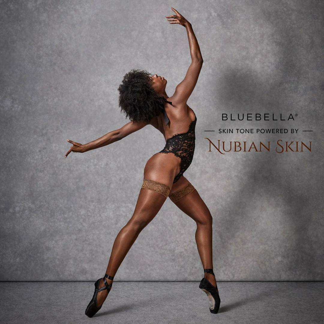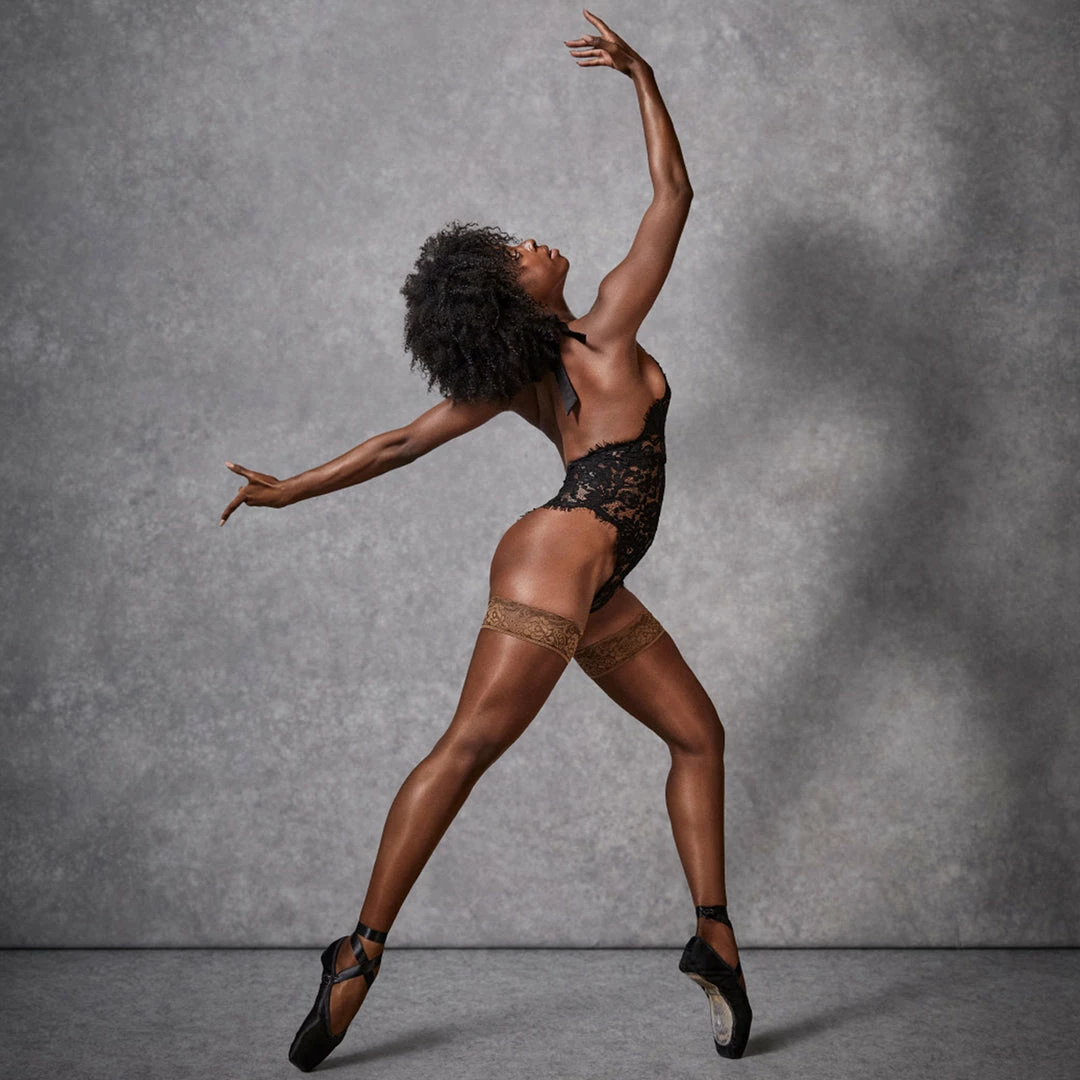Intricate lace tops bring an opulent feel to these seductively soft, sheer hold ups. Smooth yarns caress the skin, while the lace-detailed silicone top comfortably secures them in place. Designed for a flawless look, these hold ups are manufactured in Italy for a premium finish and feel. Skin tone powered by Nubian Skin. Model is wearing the Natalia Body in black.