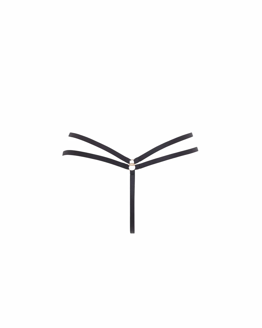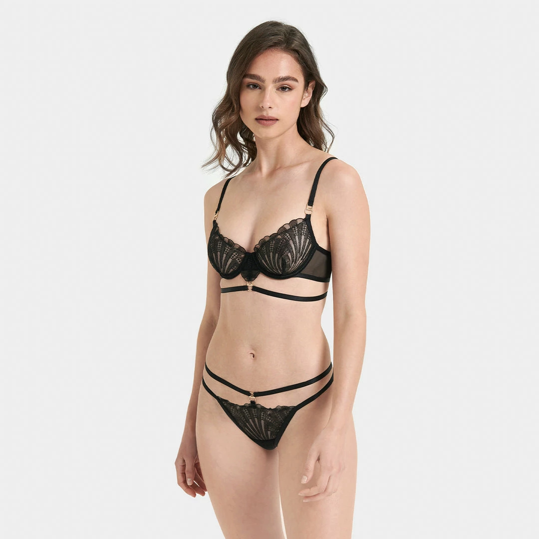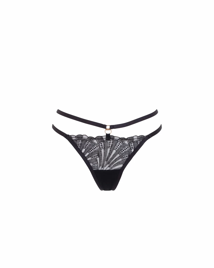 Art Deco-inspired embroidery is undeniably the star of the Hallie collection. This unique thong frames your figure with directional straps joined by elegant gold-tone hardware, ensuring a final look that’s equal parts opulent and flattering. Teasing the eye with its semi-sheer elements, this provocative piece is made for styling with the matching Hallie bra for a look of unmatched chic.