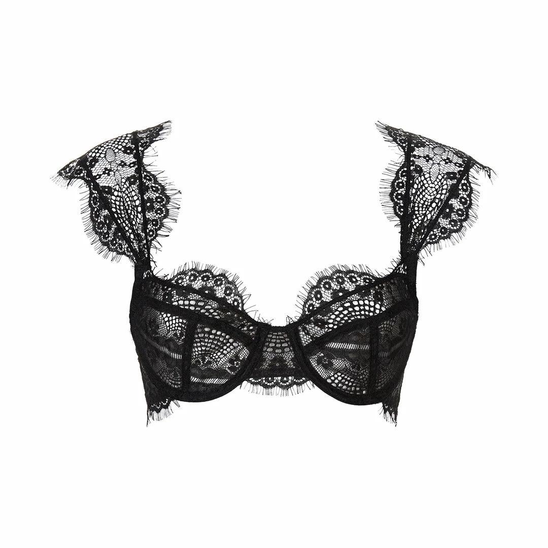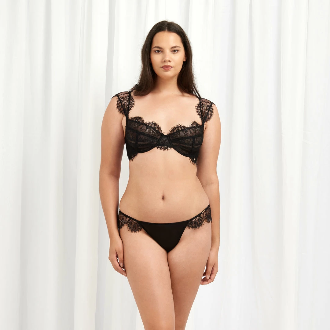 Delicately beautiful underwired bra in eyelash lace with wide shoulder strap detail. The adjustable lace statement straps are edged with narrow elastic to keep them in place. The eyelash lace extends under the cups creating a delicate underband. Non padded balcony cup shaping. Style with the matching thong.