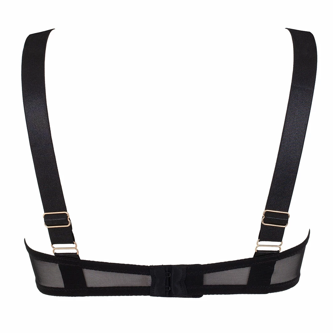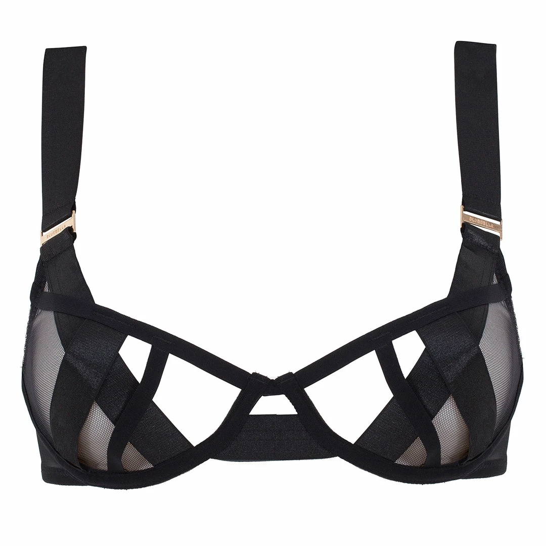 Elegant and contemporary, the Sawyer Bra works with superfine mesh and directional banding to create an unforgettable lingerie look. Elasticated strapping creates provocative cut outs whilst geometric gold tone hardware brings an industrial glamour. Fully adjustable shoulder straps ensure the perfect fit. Wear with other items from the Sawyer collection for a bold and modern look.Â