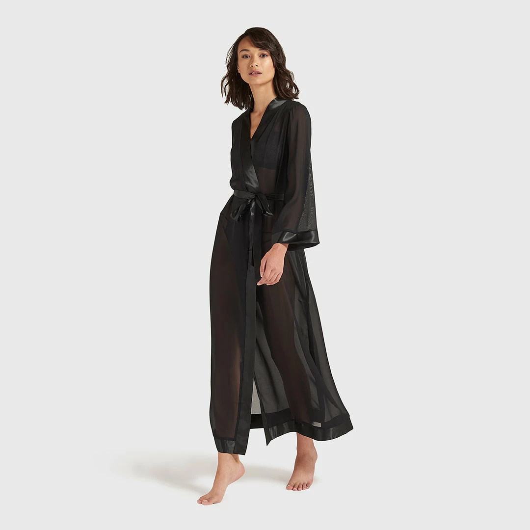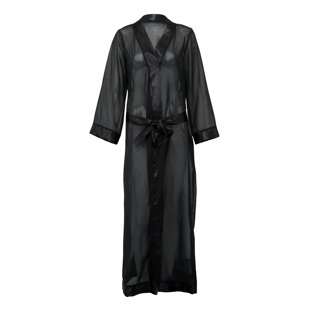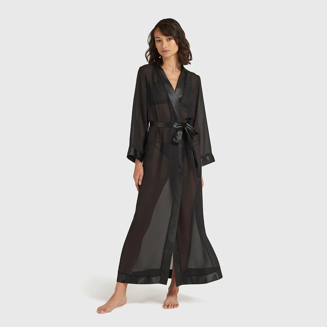This full length luxurious chiffon kimono is a must-have item to complete your lingerie and nightwear wardrobe. Soft sheer chiffon, edged with a deep satin trim around the leading edge and and cuffs. Luxurious satin waist tie.