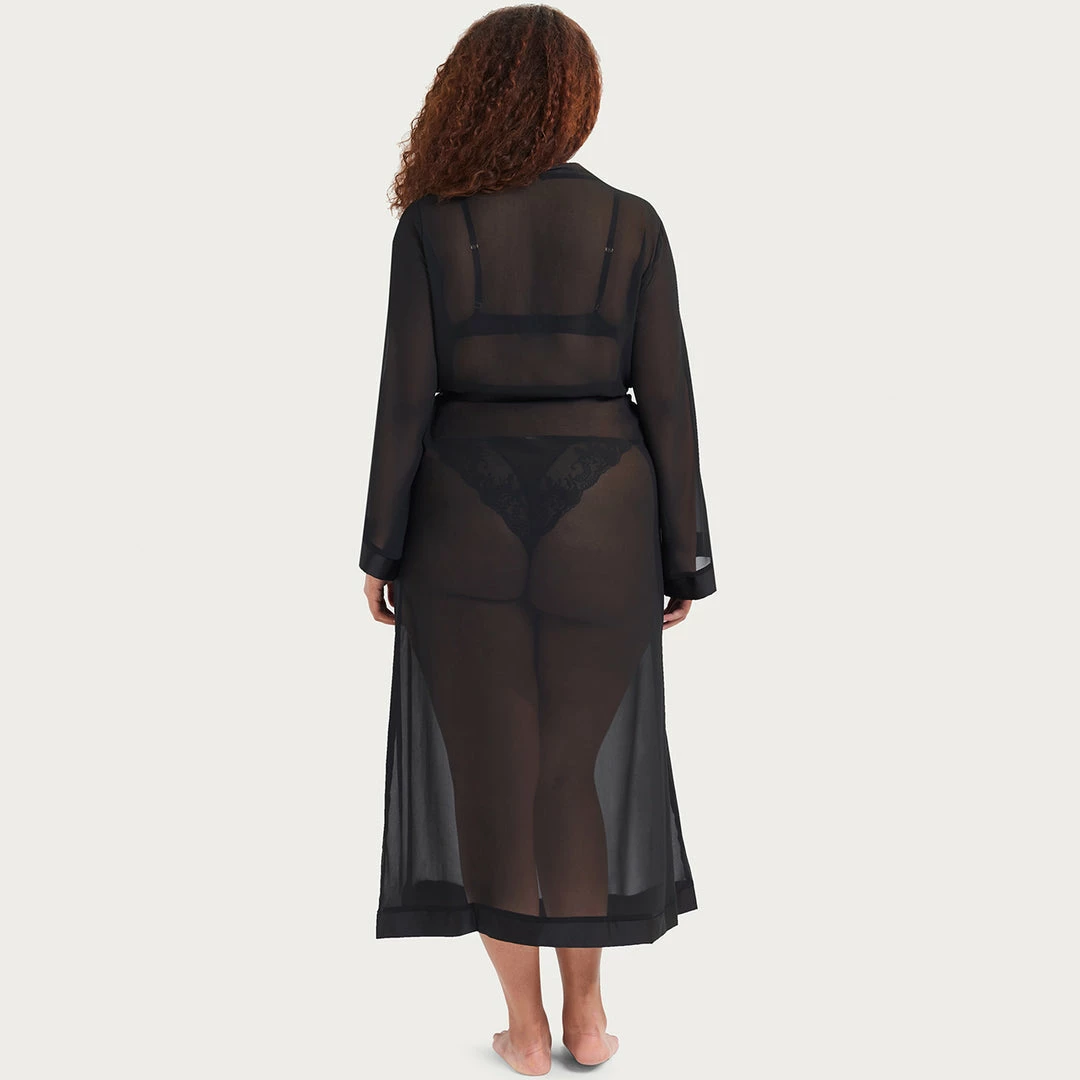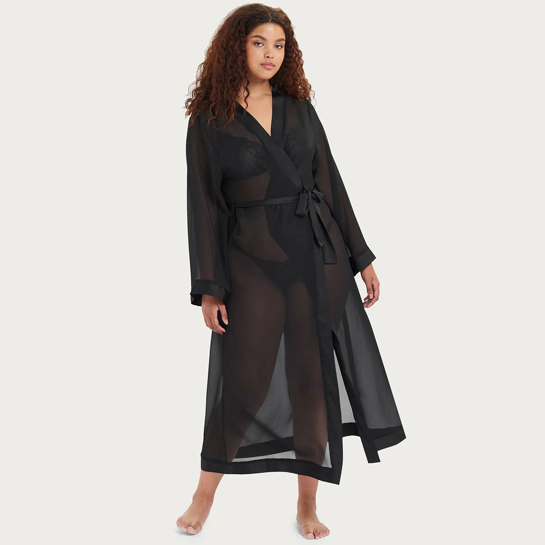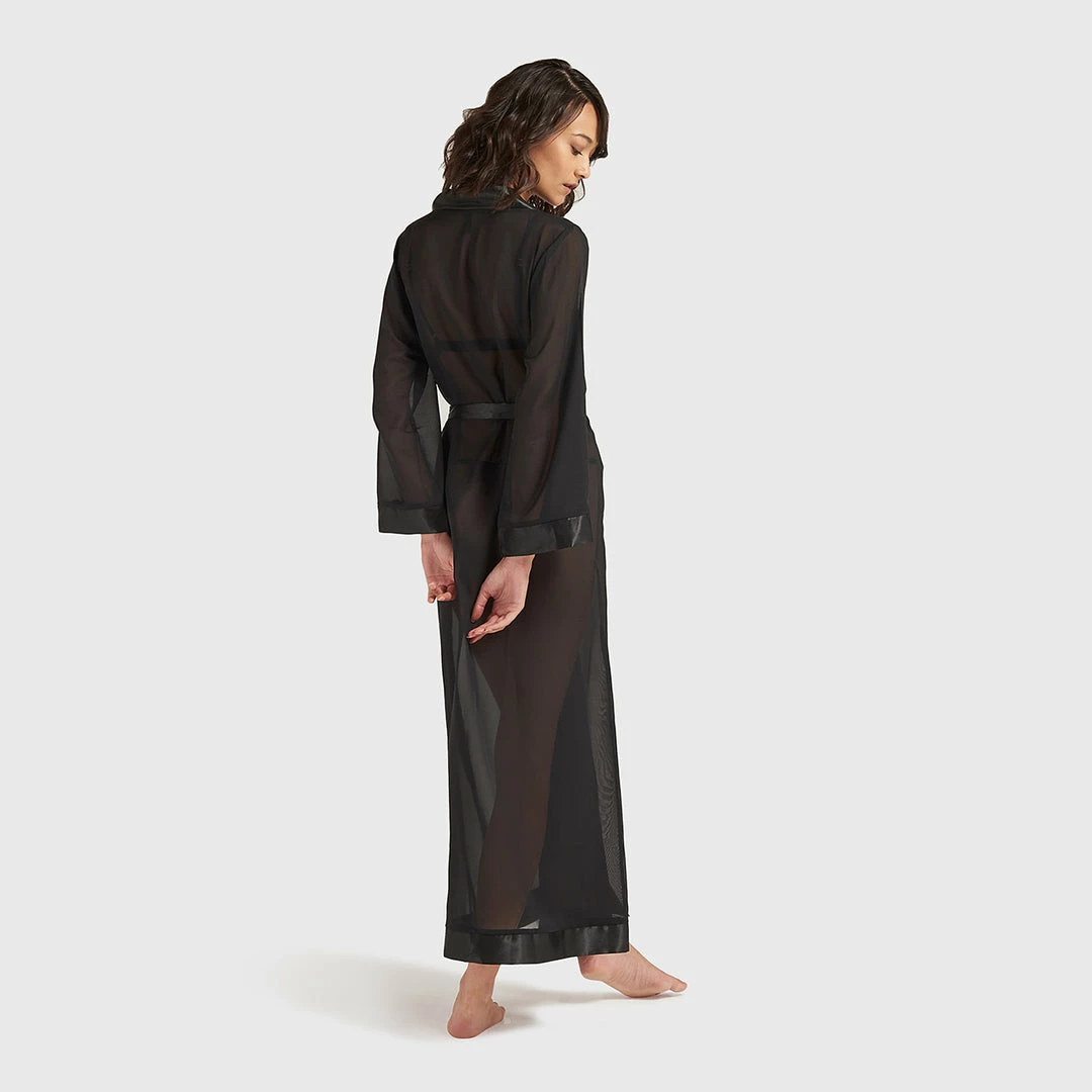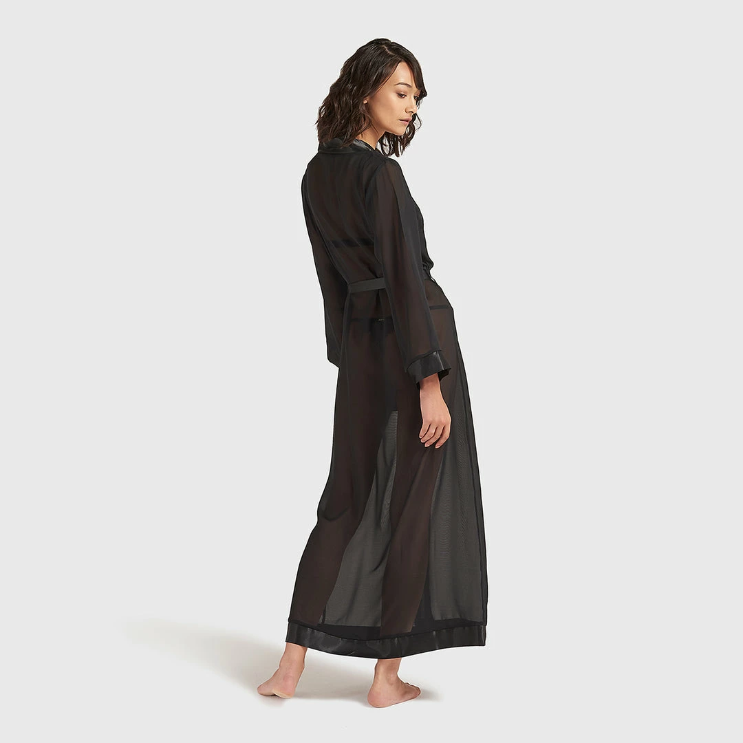 This full length luxurious chiffon kimono is a must-have item to complete your lingerie and nightwear wardrobe. Soft sheer chiffon, edged with a deep satin trim around the leading edge and and cuffs. Luxurious satin waist tie.