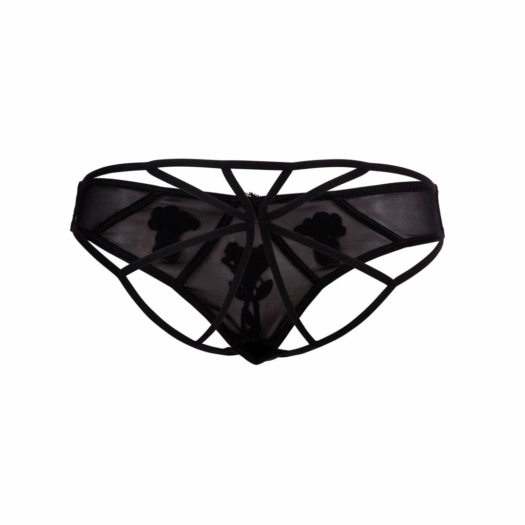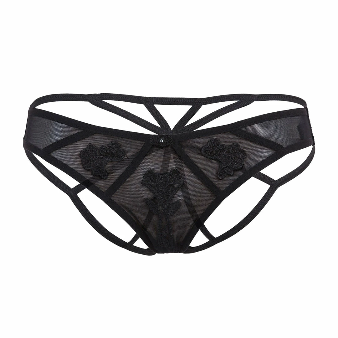 A stunning, bikini-style brief combining superfine mesh with directional strapping and appliqué lace motifs. Deliciously soft, the superfine mesh sits comfortably against the skin whilst elasticated banding ensures the perfect fit and feel. A central diamante adds a light focal point, and guipure lace details centred in front panels bring textural intrigue. The provocative open back is structured with slim banding, creating a web-effect that flatters the form. Wear with the Nova Bra for a beautiful, sensual look.