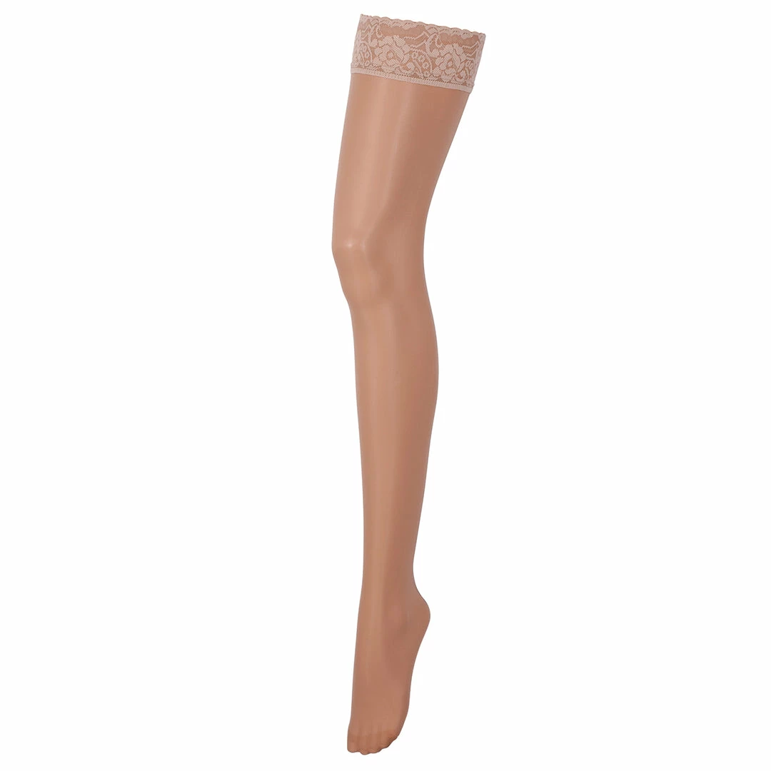 Intricate lace tops bring an opulent feel to these seductively soft, sheer hold ups. Smooth yarns caress the skin, while the lace-detailed silicone top comfortably secures them in place. Designed for a flawless look, these hold ups are manufactured in Italy for a premium finish and feel. Model is wearing the Natalia Body in black.