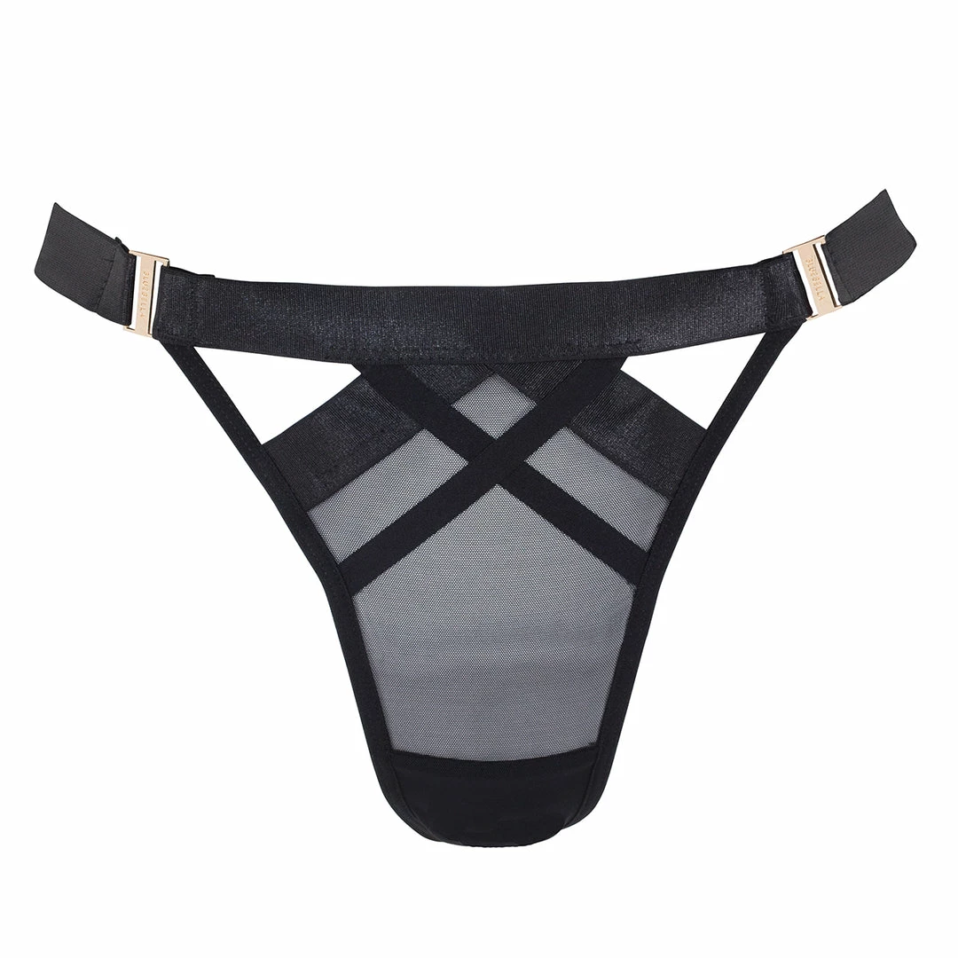 Bold and modern, the Sawyer Thong combines mesh and directional banding to stunning effect. The superfine mesh is soft and provocatively sheer, framed by geometric cut-outs in the front panel. Chunky gold tone hardware adds to the contemporary feel of this piece, with a broad elasticated waistband creating a simple and flattering line. Wear with other pieces from the Sawyer collection for an unforgettable lingerie look.Â