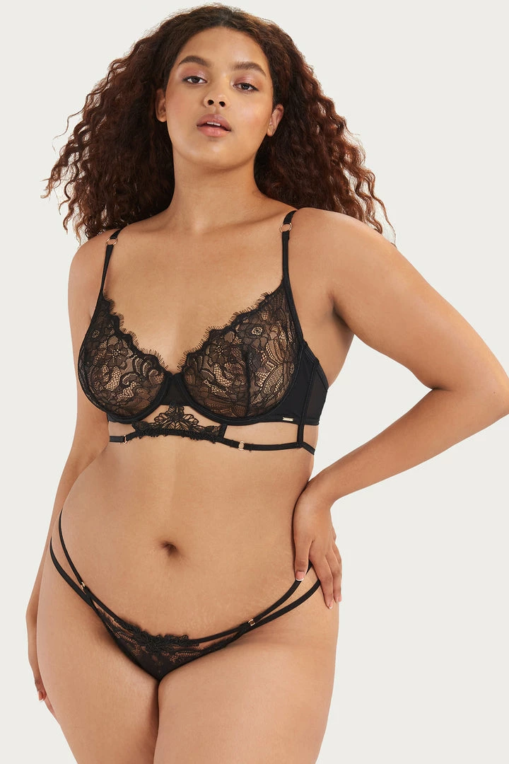Intricate and beautiful eyelash lace combines with directional design to create intricacy and textural intrigue. Contrast lace panels link to slim, elasticated banding and superfine mesh that sits soft against the body, while gold-tone hardware adds a touch of opulence to this delicately delightful lingerie set.