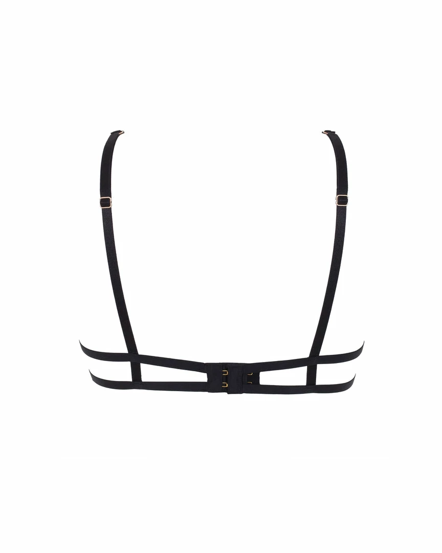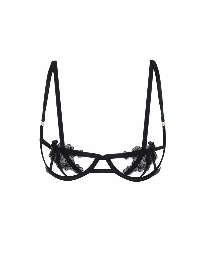 Experiment with the minimal yet impactful structure of the Sierra bra whenever coverage isn’t a priority. A masterclass in artful provocation, this coquettish piece features delicate lace and embroidery to the open cups, ensuring the final look is nothing short of show-stopping. For a look that inspires seductive pursuits, style with the matching Sierra thong.