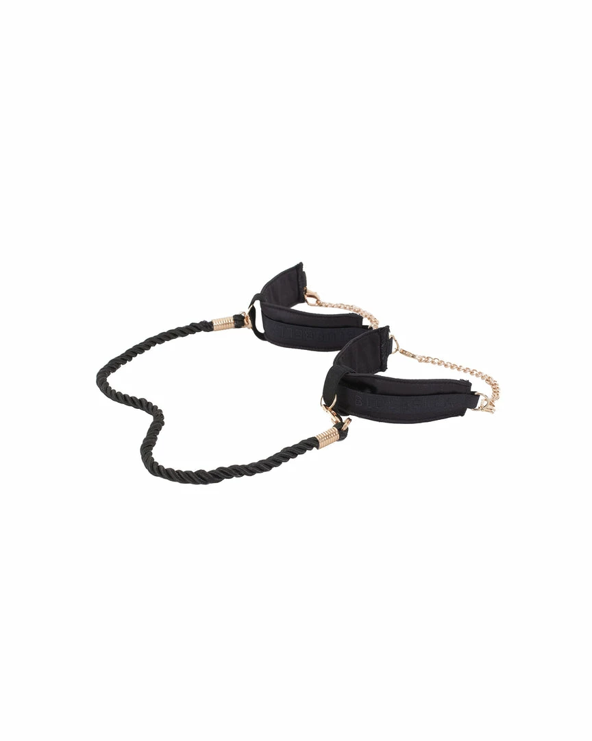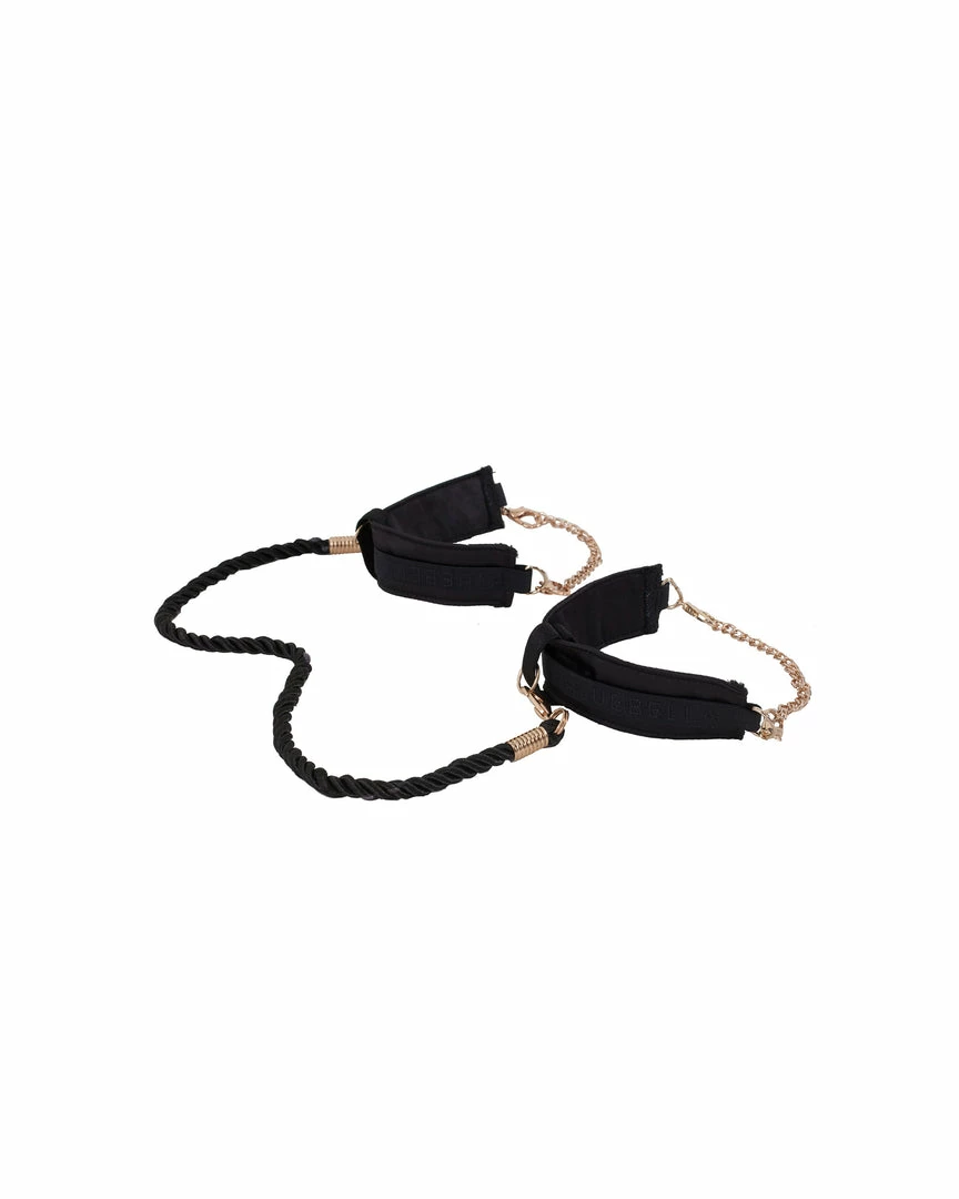 Unique and versatile cuffs. Comfortable and easy to wear, these cuffs are embellished with chain detailing and a chic, silky rope. Wear on their own or threaded through the loops in the Zuri Thong and High-Waist Brief. Shown also with the Ina Nipple Pasties.